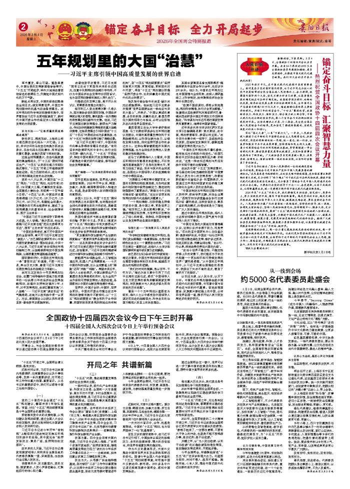 3月3日,出席全国两会的代表、委员已经报到,大会准备工作全部就绪。约5000名代表委员,带着行囊里的调研、笔记本上的民意、行业一线的思考,共赴这场春天的盛会。 基层火热实践、群众真切期盼