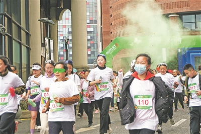 活动现场,随着一声哨响,彩色烟雾腾空而起,参与者开始沿着跑道大步奔跑,引来沿途观众的阵阵加油声。赛道两侧,志愿者不断挥舞着手中的加油棒,并将彩色粉末撒向跑者,为奔跑的队伍增添了更多欢乐氛围。
