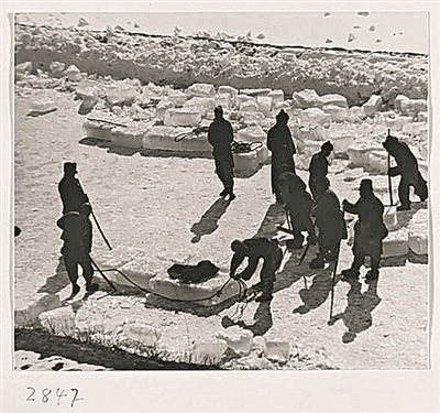 采冰并用绳索牵引冰块。