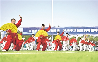 在宁夏银川市金凤区览山公园举行的全民健身主题活动上,群众参加百人功夫扇展演(2025年6月10日摄)。