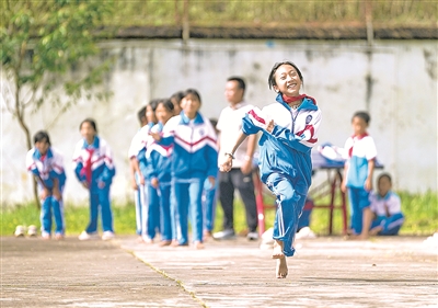 在云南省普洱市孟连傣族拉祜族佤族自治县,腊福小学学生课间在操场进行奔跑接力比赛(2025年9月15日摄)。