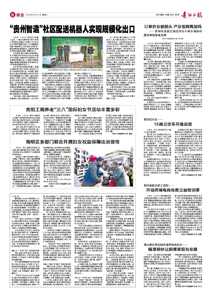 本报讯 3月9日,贵州本土机器人企业——融云创新科技(贵州)有限公司首批社区配送AI机器人出口发运仪式在贵阳高新区举行,6台智能配送机器人整装待发,即将远赴马来西亚、新加坡等地的高端社区,这