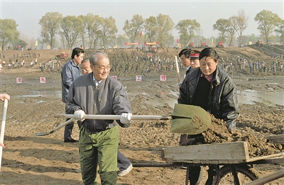 1991年11月13日,宋平同志(左)来到北京市通县(今通州区)张家湾凉水河整治工程工地参加劳动。 新华/传真