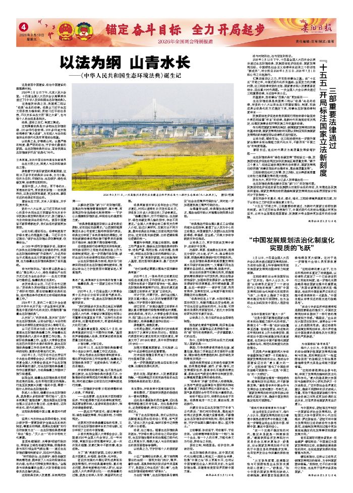 3月12日,十四届全国人大四次会议表决通过国家发展规划法,为在法治轨道上科学编制和有效实施国家发展规划提供有力制度保障。