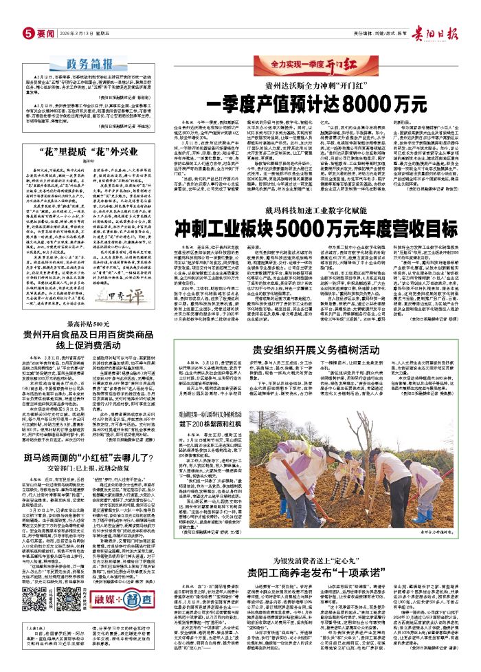 本报讯 3月12日,贵安新区组织开展2026年义务植树活动,党员干部、企业代表以及社会组织等各界人士分时段、分区域参与,以实际行动为新区生态建设再添新绿。 当天上午,植树活动在贵安新区