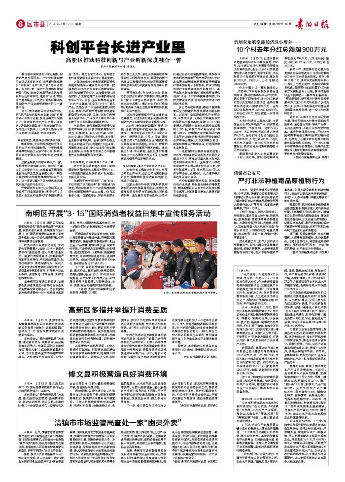 本报讯 3月15日,南明区市场监督管理局紧扣“提升消费品质”年度主题,在贵阳浙江商城、贵钢花鸟市场开展“3·15”国际消费者权益日集中宣传服务活动,进一步优化消费环境,切实维护消费者合法权益