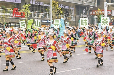 2025年“5·19 中国旅游日”贵州民族团结大巡游现场,乌当非遗苗族花棍舞走上贵阳街头,与市民、游客互动。