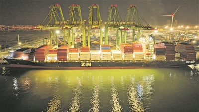 ▶2026年1月1日晚,运载智利车厘子的“以星伊比利亚”轮靠泊在天津港太平洋国际集装箱码头(无人机照片)。