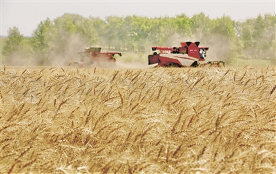 2025年8月5日,位于黑龙江省五大连池市的大庆油田农场调动多台联合收割机抢收小麦。