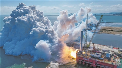 2025年9月15日,天龙三号液体运载火箭在山东海阳东方航天港海上平台进行一级动力系统试车(无人机照片)。