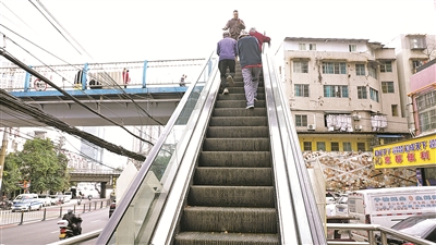 市民在沙冲中路人行天桥停运的自动扶梯上通行。