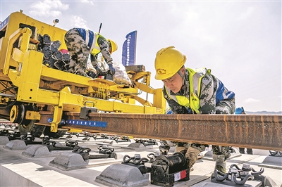 图为3月18日,工人在渝昆高铁施工现场进行铺轨作业。