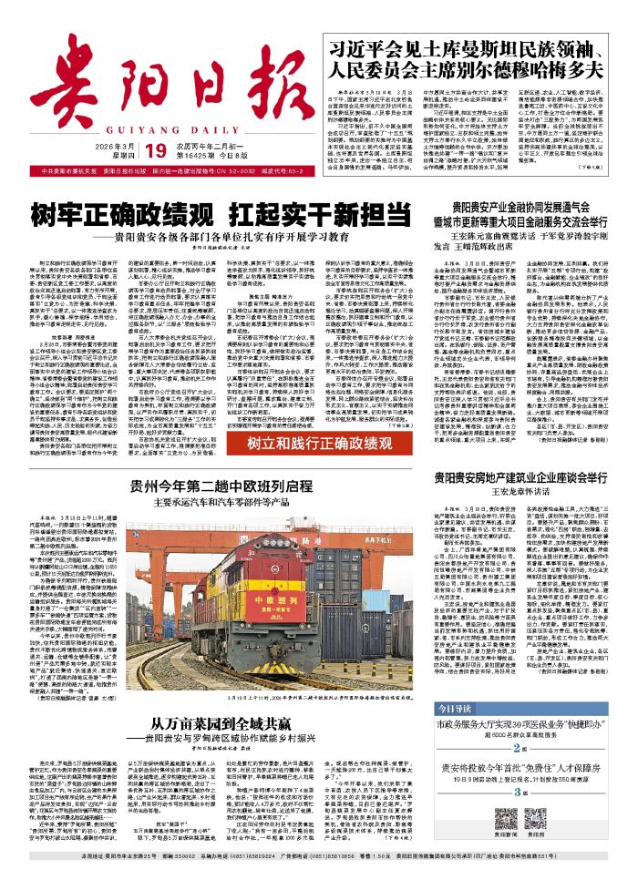 本报讯 3月18日上午11时,随着汽笛鸣响,一列载着55个集装箱的货物列车缓缓驶出贵阳国际陆港都拉营站,一路向西奔赴欧洲,标志着2026年贵州第二趟中欧班列启程。 本次班列主要承运汽车
