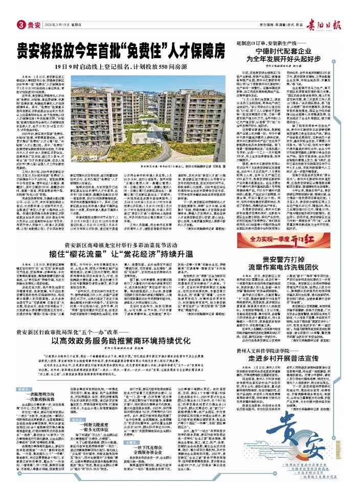 本报讯 3月18日,贵安新区党工委组织人事部发布公告,明确贵安新区2026年第一批“免费住”人才保障房将于3月19日9时启动线上登记报名,首批计划投放550间房源。 近年来,贵安新区持
