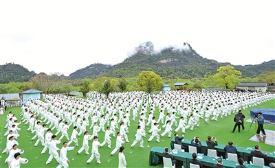 图为在首个“国际太极拳日”太极拳展演活动主会场福建南平武夷山,太极拳爱好者展演太极拳。