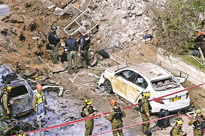 据伊朗伊斯兰共和国广播电视台24日报道,伊朗当天向以色列发动新一轮导弹袭击,“导弹已突破以色列多个导弹防御系统”。图为3月24日,在以色列中部城市特拉维夫,应急人员在导弹袭击现场处置。 新华/传真