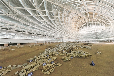 牛河梁国家考古遗址公园祭坛、积石冢保护展示馆内景。新华/传真