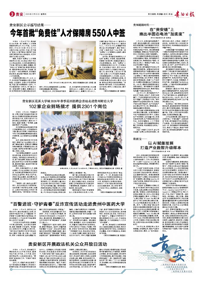 本报讯 3月24日,“四城拓万岗·才聚大学城”贵安新区花溪大学城2026年春季巡回招聘会首站走进贵州财经大学,共吸引省内外102家优质企业到场揽才,提供2301个岗位,涵盖大数据、广告传媒、