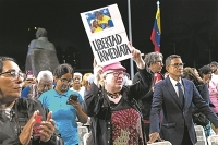 遭美国强行控制的委内瑞拉总统马杜罗即将在纽约第二次“出庭受审”。25日晚,在委内瑞拉首都加拉加斯市中心的玻利瓦尔大道上,来自委各地的民众举行守夜活动。人们高举国旗和标语,大声喊着“释放马杜罗”