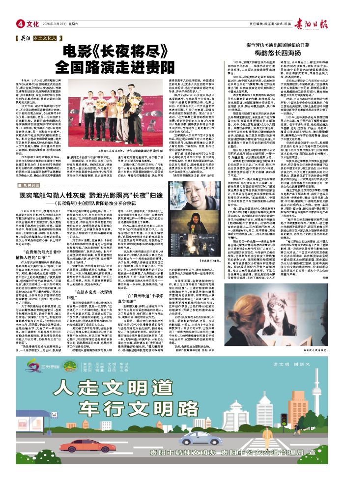 本报讯 3月26日,现实题材口碑佳作《长夜将尽》全国路演正式走进贵阳,影片监制及领衔主演饶晓志、导演王通等主创团队先后亮相贵阳星空影城、卢米埃影城,与观众面对面分享影片创作的幕后故事,共赴这