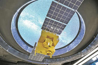 2025年7月1日在位于安徽省合肥市的中电信量子信息科技集团有限公司科技体验馆内拍摄的“墨子号”量子卫星模型。
