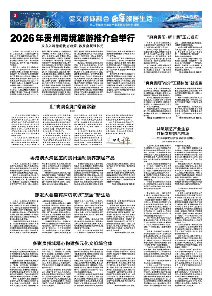本报讯 以山水为媒,以文旅为桥。3月30日,第二十届贵州旅游产业发展大会专项领域主体活动之2026年贵州跨境旅游推介会举行,来自不同国家的跨境文旅行业负责人、省内外资深旅行社从业人员齐聚一堂
