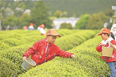 春假期间,同学们走出课堂,在丰富多彩的实践活动中拓宽眼界,度过健康快乐、富有收获的假期。图为4月1日,小朋友在开阳县龙岗镇坝子村生态茶园体验采摘春茶。 新华/传真