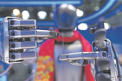在中关村展示中心常设展上,一台配备了灵巧手的机器人在展示穿针引线(2026年3月25日摄)。