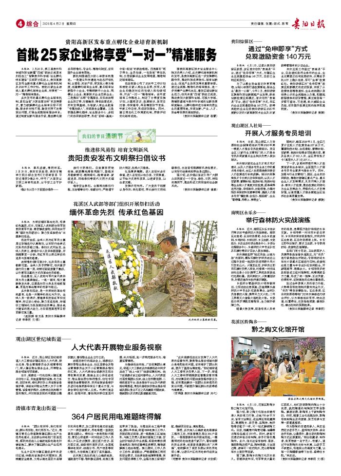 本报讯 春风送暖,清明将至。3月30日,贵阳市民政局、贵阳市精神文明办联合发布《文明寄哀思 平安过清明》倡议书,呼吁广大居民以文明之举寄托追思,以平安之念守护家园。 倡议书从四个方面提