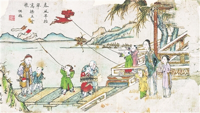 从清代年画《春风得意》中可以看出,清明时节放纸鸢是当时民众喜爱的活动。