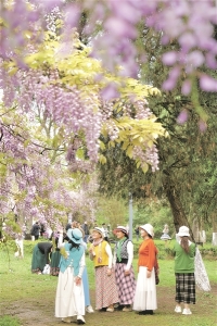 4月,微风不燥,春光正好,花溪公园的紫藤开得正盛。嫩绿的叶子缀在深深浅浅的紫色之间,阳光透过花帘洒下来,光影斑驳,整条长廊便笼在一片淡紫色柔光里。紫藤架下,游人仰头将美景轻轻收进取景框,长椅旁