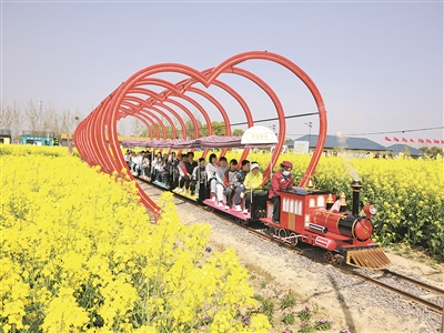 4月4日,游客在江苏省盱眙县黄花塘镇向阳花海乘坐小火车游玩。 新华/传真
