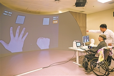 图为4月7日,在贵阳市北京积水潭医院贵州医院,医生在指导患者进行脑机接口康复训练。