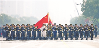 受阅部队最前方,中国共产党党旗、中华人民共和国国旗、中国人民解放军军旗在仪仗方队护卫下迎风招展。