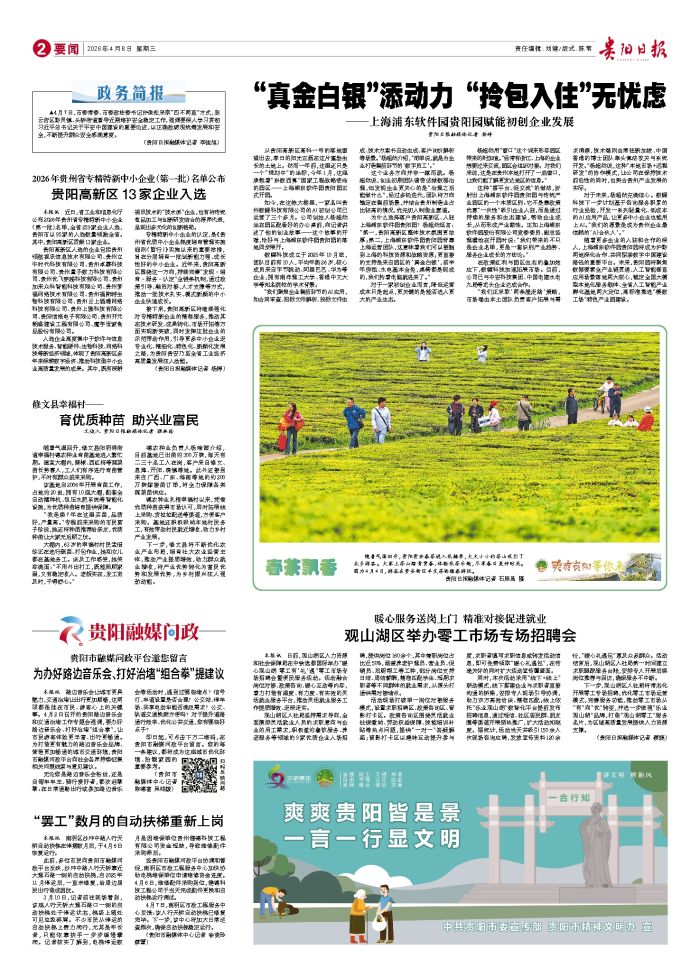 本报讯 近日,省工业和信息化厅公布2026年贵州省专精特新中小企业(第一批)名单,全省259家企业入选,贵阳市以95家的入选数量领跑全省。其中,贵阳高新区贡献13家企业。 贵阳高新区入
