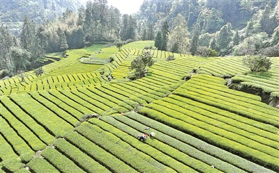 图为4月9日,湖北省宣恩县椒园镇中坝社区的茶农在采摘春茶(无人机照片)。