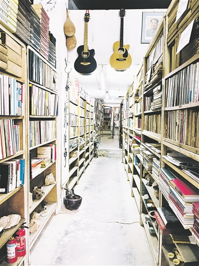 书店约有一百平方米,书架摆成了图书馆的样子,每个书架都是满满当当塞满了旧书。书店里不但书是旧的,其他一切也都是旧的,木质书架被时光上了色,旧木吉他从房顶悬挂下来,仿佛已经挂了几十年,有些旧书在书架的角落里,仿佛许久未曾被翻动过,时间在这家书店里仿佛也停住了,一切都是那么使人安心。我的目光在一排排旧书的书脊上巡视,边看边感叹,从明清时期的老书,到上世纪八九十年代的旧书,都整齐有致,每一本书都勾连着诸多回想与感念,只是来不及深入细想那些思绪,来不及去仔细放大那些念头,因为每个念头的背后,都牵连着有关出版、阅读、历史、文化的线索……