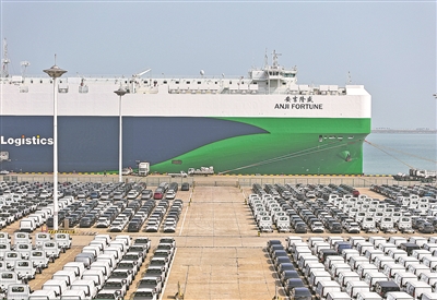 ◀2026年4月10日,在江苏省连云港港东方港务分公司码头,滚装轮停在泊位装载出口汽车(无人机照片)。