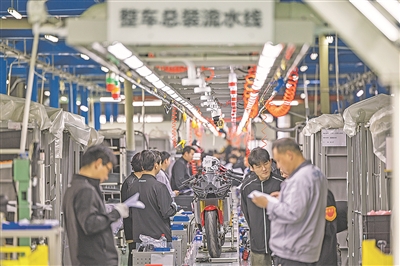 ▶2026年4月1日,工作人员在重庆两江新区“张雪机车”生产车间整车总装流水线上作业。
