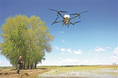 2025年5月21日,在北大荒集团黑龙江绥滨农场有限公司东井管理区,操作员操控搭载北斗导航系统的植保无人机作业。