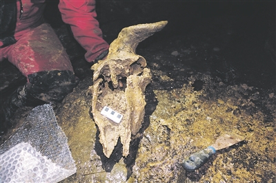 在贵州绥阳双河洞发掘现场发现的羚牛头骨。受访者/供图
