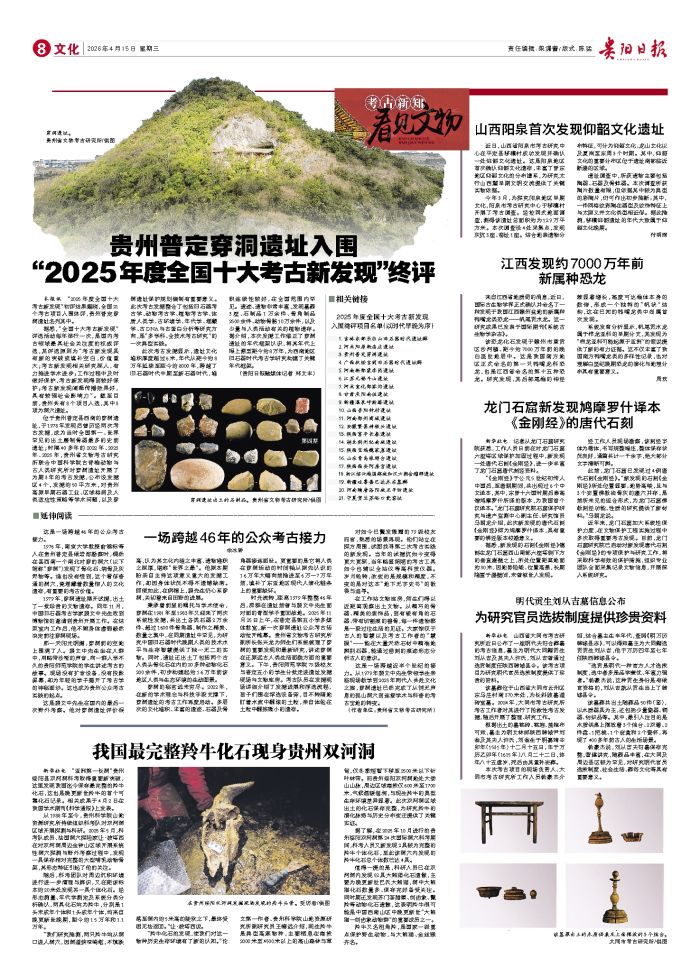 本报讯 “2025年度全国十大考古新发现”初评结果揭晓,全国21个考古项目入围终评,贵州普定穿洞遗址名列其中。 据悉,“全国十大考古新发现”评选活动每年举行一次,是国内考古领域最具社会