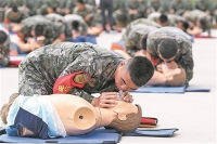 为促进军地融合发展,提升部队官兵的应急救护能力,近日,武警贵州总队训练基地联合贵州省紧急医学救援调度中心,开展“应急救护培训进军营”活动,以专业化培训锤炼官兵战场自救互救本领。 图为武警