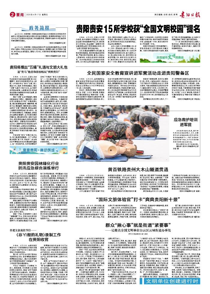 本报讯 4月16日,记者从市文明办获悉,贵州省精神文明建设办公室启动全国文明校园推荐评选工作,贵阳贵安15所学校入选全国新一届精神文明创建周期全国文明校园提名学校,向“全国文明校园”称号发起
