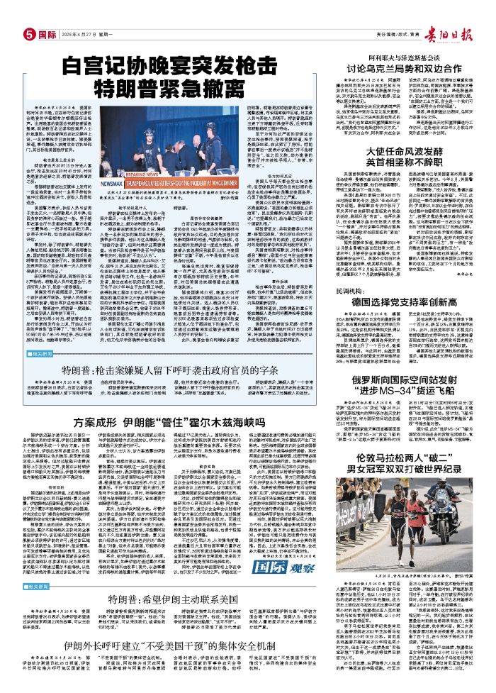 新华社北京4月26日电 美国东部时间25日晚,正在举行白宫记者协会晚宴的华盛顿希尔顿酒店传出枪声。出席晚宴的美国总统特朗普紧急撤离,现场数百名记者和政商界人士趴地避险。特朗普稍后在社交媒体上