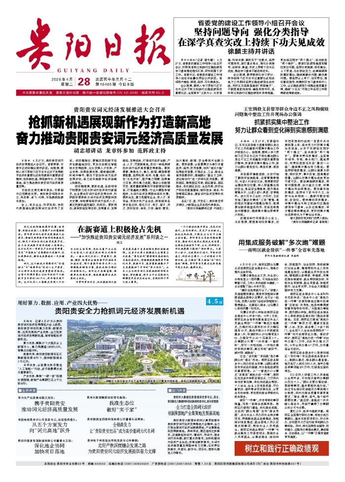 本报讯 记者4月27日从贵阳贵安词元经济发展推进大会上获悉,贵阳贵安将依托算力优势、数据优势、应用优势和产业优势,全力抢抓词元经济发展新机遇,培育智能经济新形态。 算力优势:集聚27个