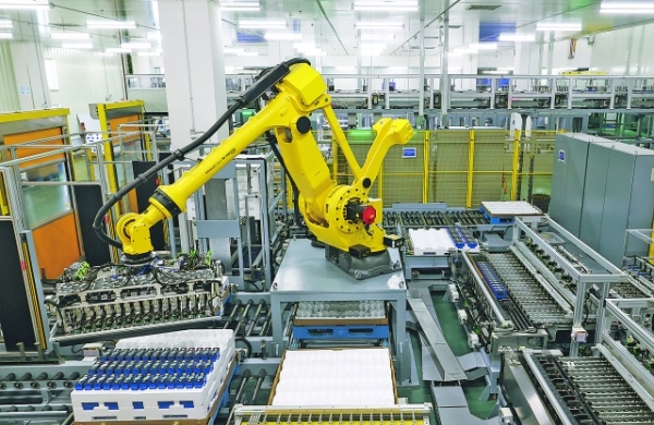 在宁德时代贵州基地容量厂房里,机器臂正在码放电芯。 贵阳日报融媒体记者 石照昌 摄