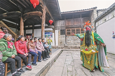 春节临近,浙江省金华市金东区20多个民间剧团迎来了迎新春演出旺季。金东区是婺剧之乡,婺剧表演有着深厚的历史渊源和广泛的群众基础,目前全区活跃着大大小小28个婺剧民间剧团(社),拥有澧浦郑店、任宅前等12个区级婺剧特色村,还涌现了婺之灵坐唱班、琴艺剧团等一批由婺剧爱好者自发组织的民间剧团。图为郑店村婺剧坐唱班的演员在村文化礼堂为村民们演出婺剧《关羽探营》。 新华/传真