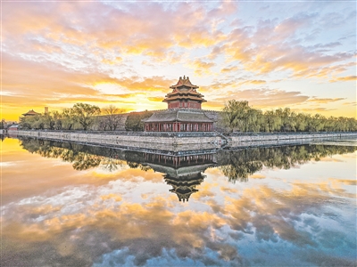 朝霞下的北京故宫西北角楼。