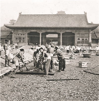 不断修缮让故宫生命永驻,这是工人们在维修北上门(1956年拆除)内地面。